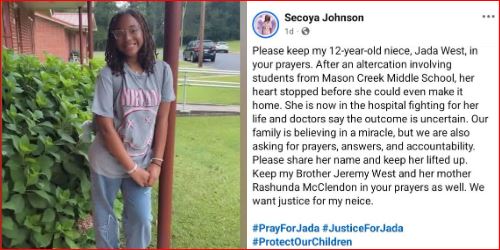 The community of Douglas County is mourning the loss of a 12-year-old student from Mason Creek Middle School who died Sunday following injuries sustained in a fight after getting off her school bus. The young girl, identified by her family as Jada West, had been hospitalized in intensive care with what her mother described as a serious brain injury before passing away on March 8.